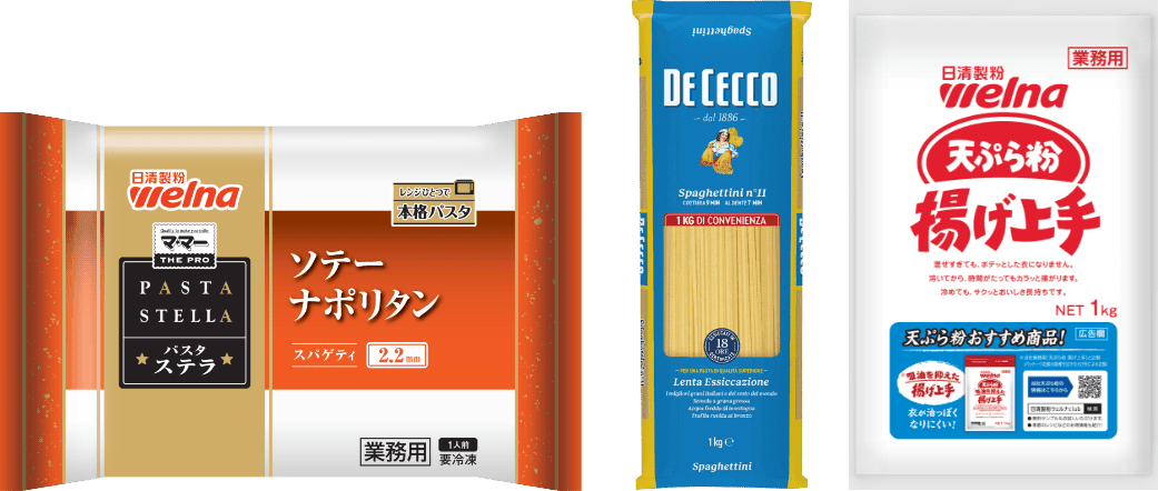 業務用プレミックス(天ぷら粉・から揚げ粉・バッター・打ち粉等)、業務用パスタ(常温・冷凍)・パスタソース(常温・冷凍)等