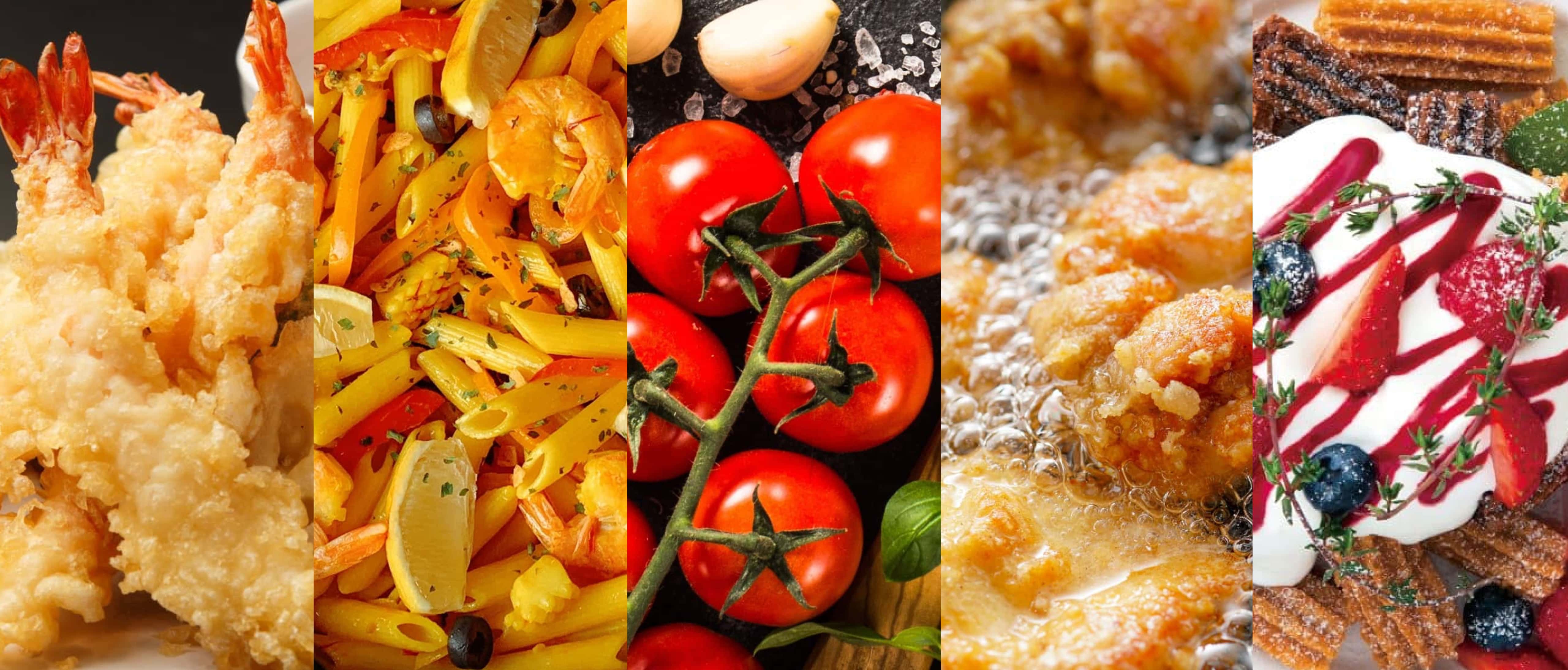 従来必要な打ち粉工程がいらない天ぷら粉3品の製品パンフレット。それぞれに特長があり、用途や販売シーンに合わせてお選びいただけます。